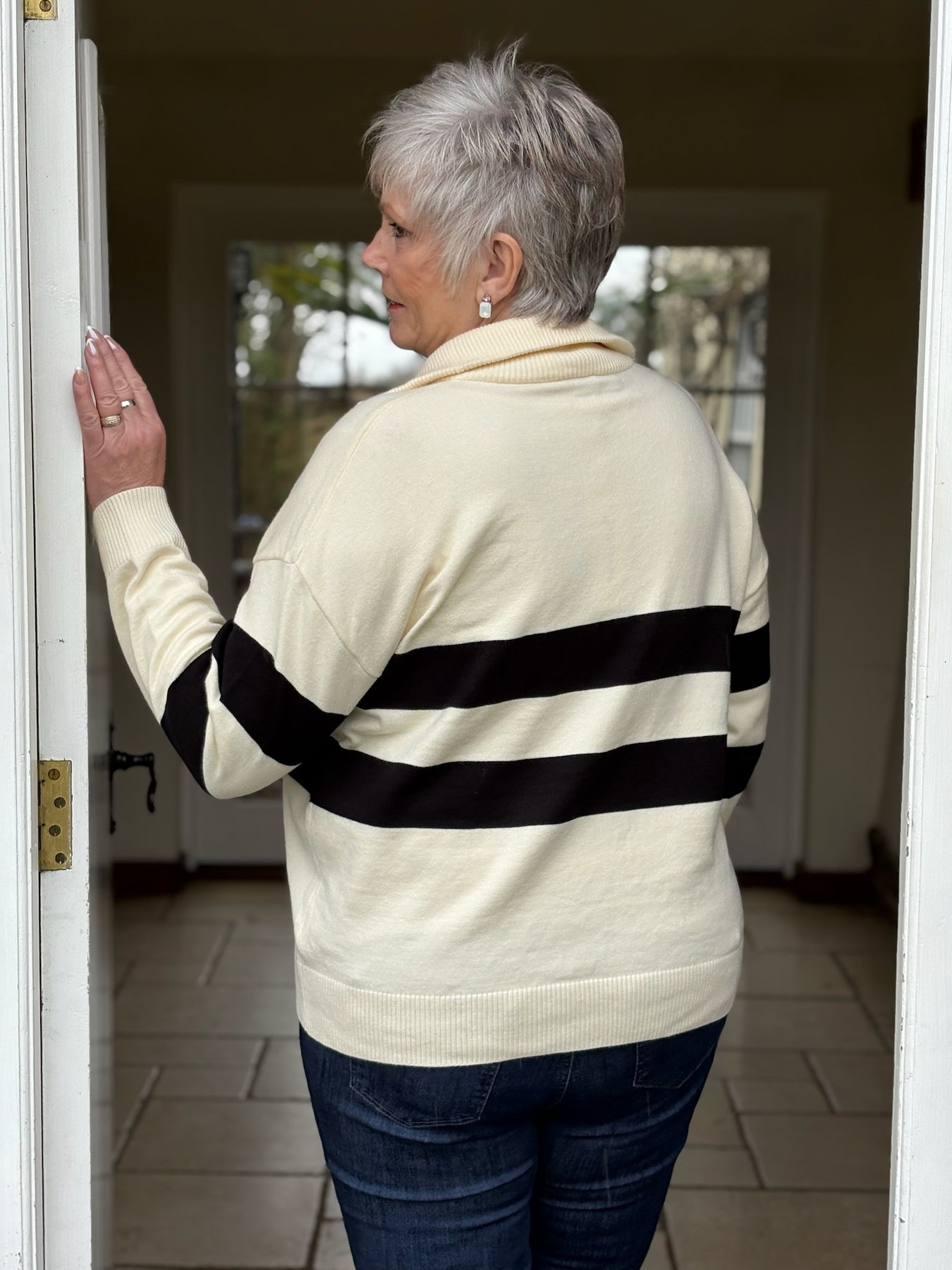 This Funnel Neck Zip Stripe Jumper features a ribbed funnel neck with a 1/4 zip for adjustable comfort, complemented by ribbed hem cuffs and a straight ribbed hemline. Designed with a relaxed fit and bold horizontal black stripes, it combines casual style with effortless sophistication. Perfect for layering, this jumper offers warmth and versatility, making it an excellent addition to your wardrobe for transitional seasons.