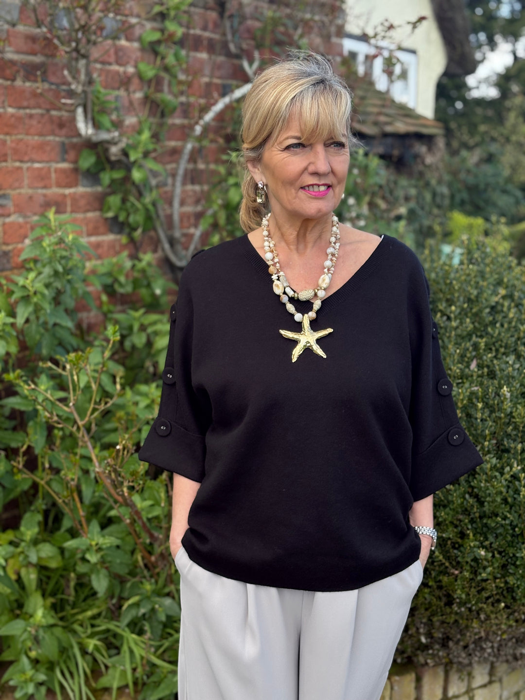 Elbow Length Button Detail V Neck Jumper - Malissa J | Black