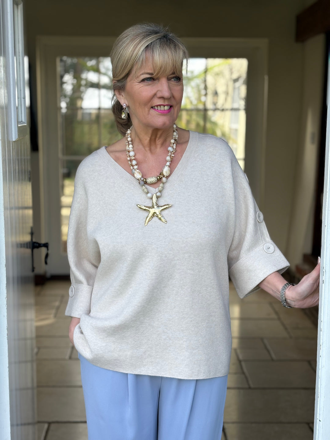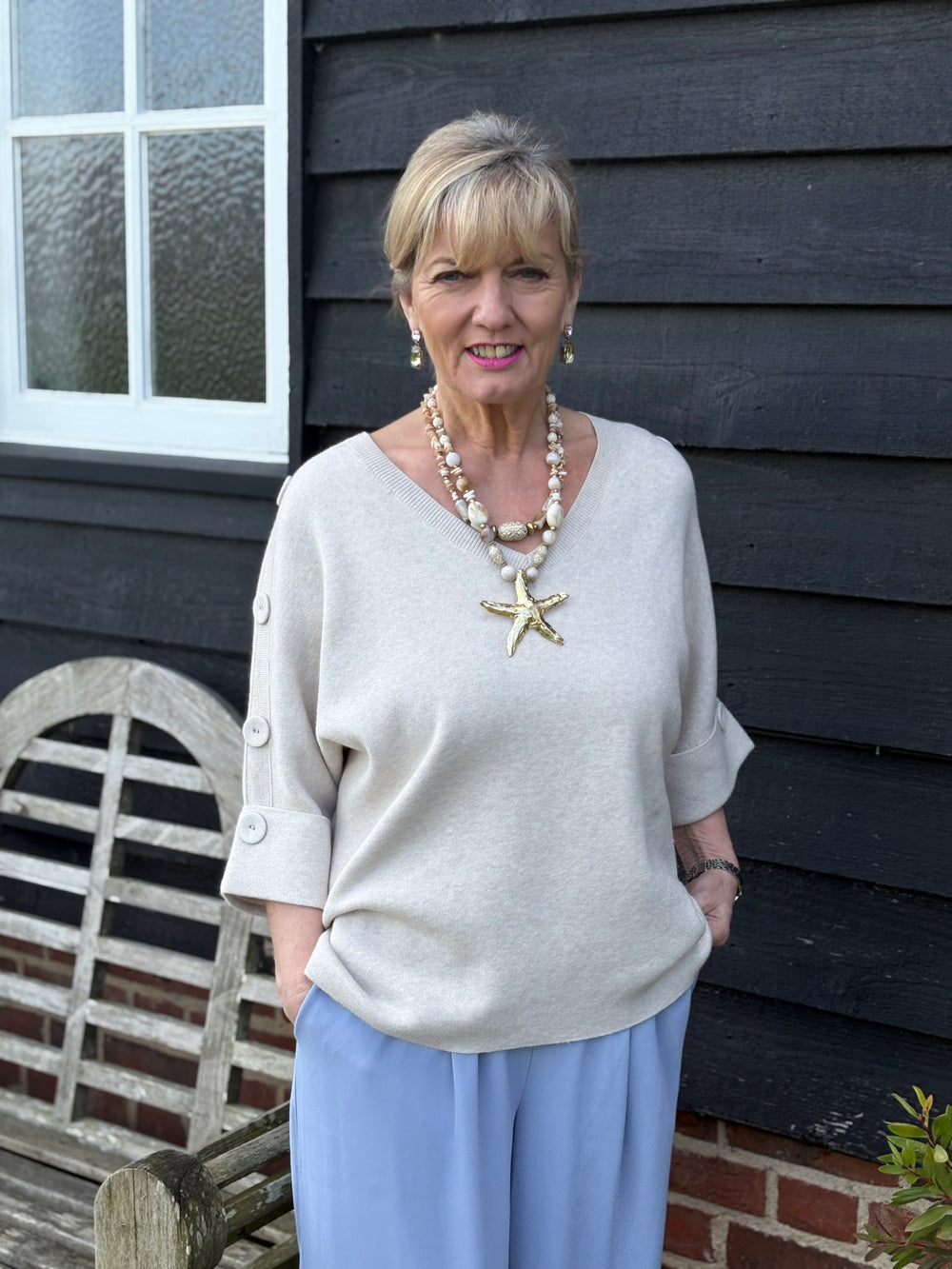 Elbow Length Button Detail V Neck Jumper - Malissa J | Oyster