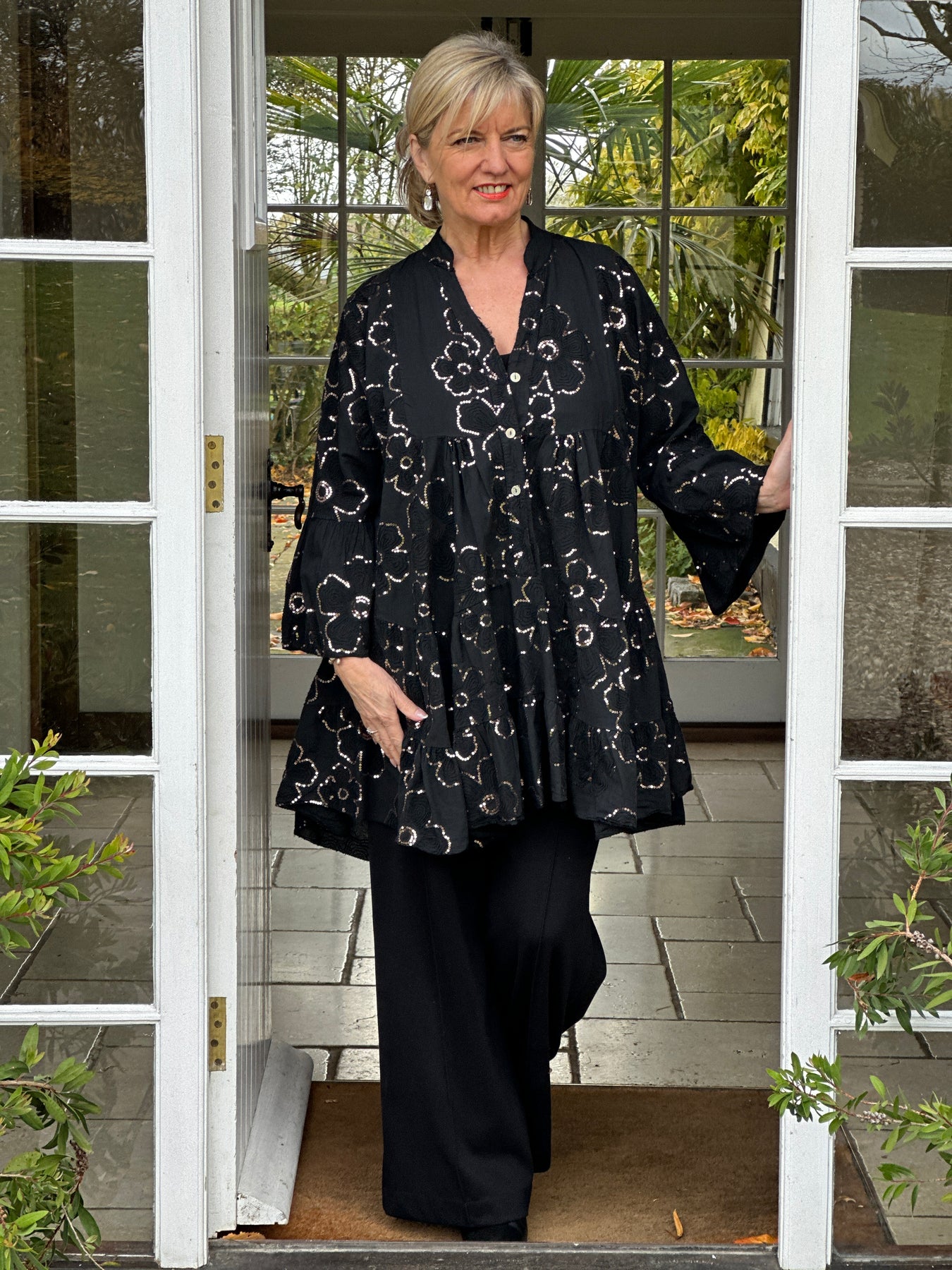 Add a touch of sparkle to your wardrobe with this stunning Black Sequin Floral Tunic Top. Designed in a relaxed, tiered silhouette, this beautiful piece features delicate floral embroidery adorned with shimmering sequins, creating a look that’s both elegant and effortlessly flattering.