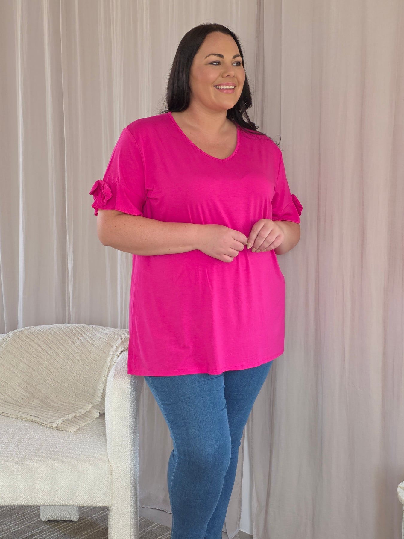 Enhance your summer wardrobe with this stylish top. Its sophisticated v-neck design exudes elegance, while the incredibly soft material ensures maximum comfort. The elegant bow detail on the sleeve is the perfect finishing touch. From casual outings to special occasions, this top is versatile and essential.