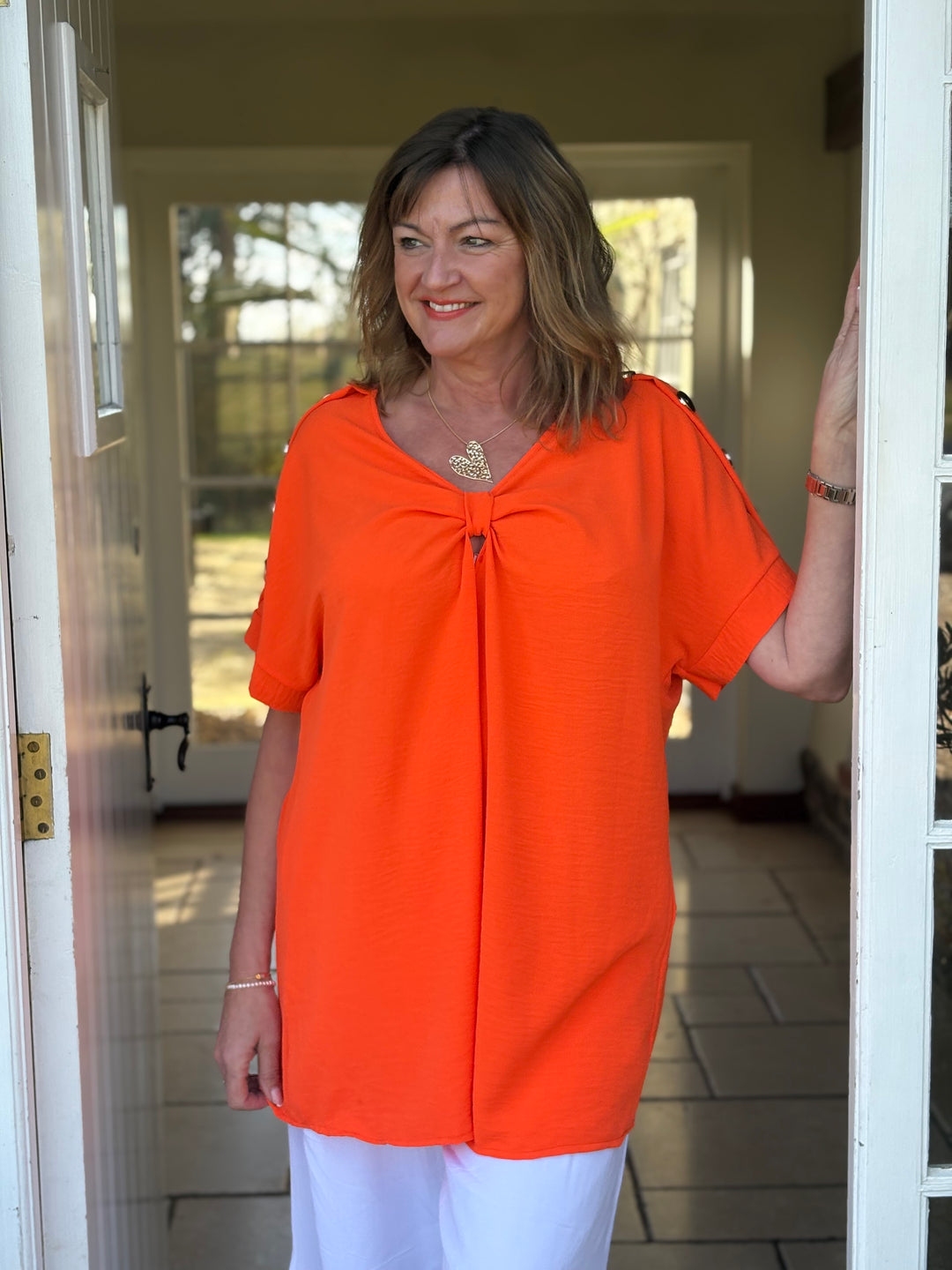 Textured Gold Button Bow Top | Orange