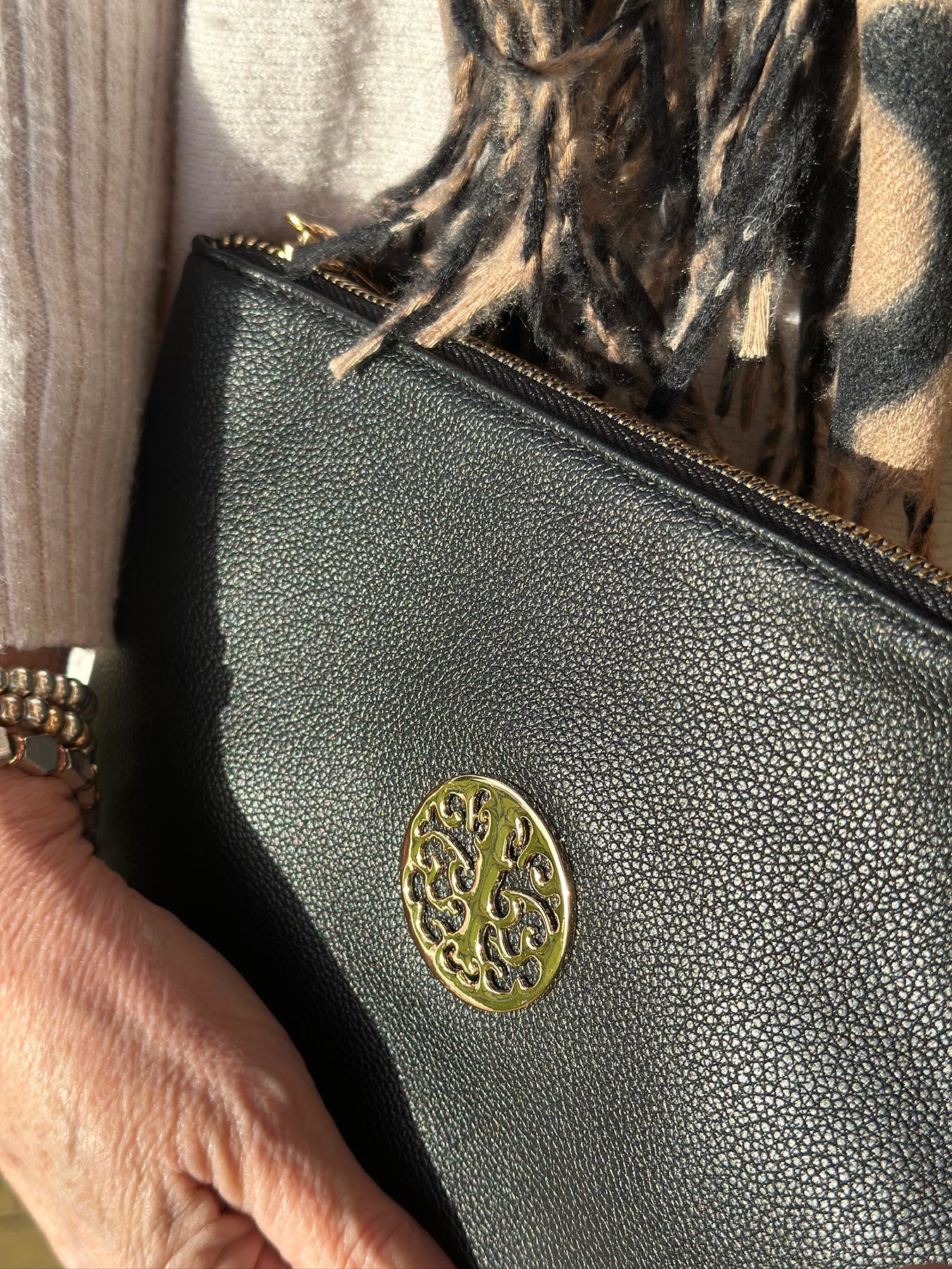 Meet the Chelsea Multiway Clutch Bag — a chic, versatile accessory designed to take you effortlessly from day to night. Crafted from soft, textured black faux leather, this beautifully structured clutch features a striking gold emblem that adds instant elegance to any outfit.