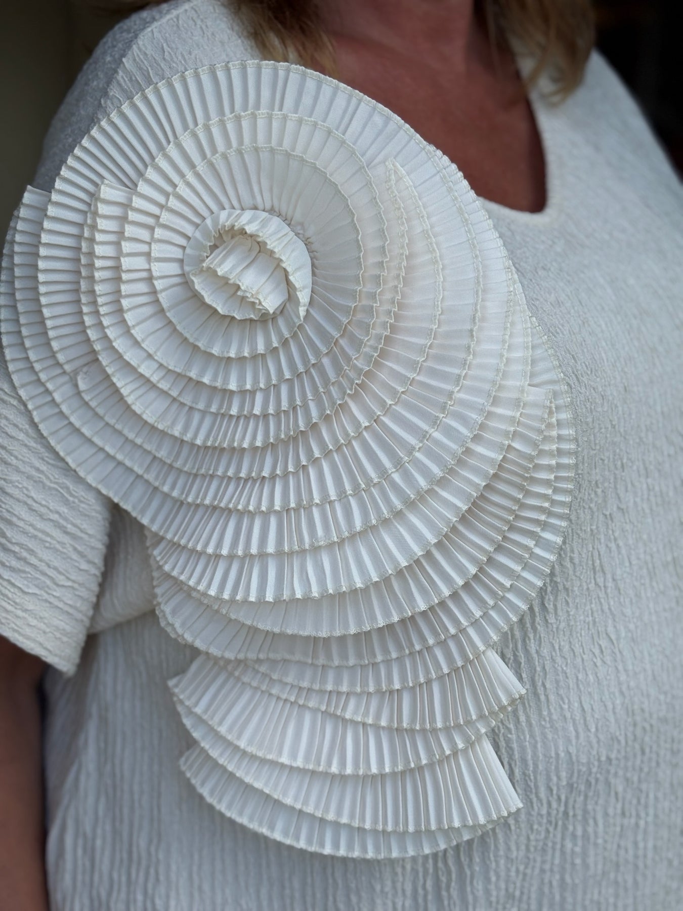 Add instant elegance to your wardrobe with the Malissa J Flower Applique Top. Designed in a soft crinkle-effect fabric, this flattering V-neck style features short sleeves and a show-stopping pleated corsage detail at the shoulder. The oversized floral accent gives a modern, feminine twist — making this top perfect for special occasions, evenings out, or elevating your everyday look. Easy to wear and effortlessly chic, it’s a true statement piece.