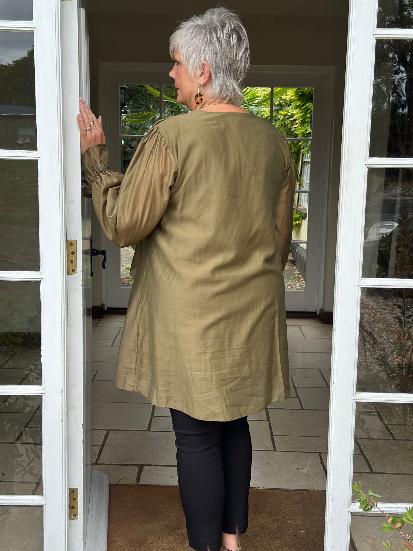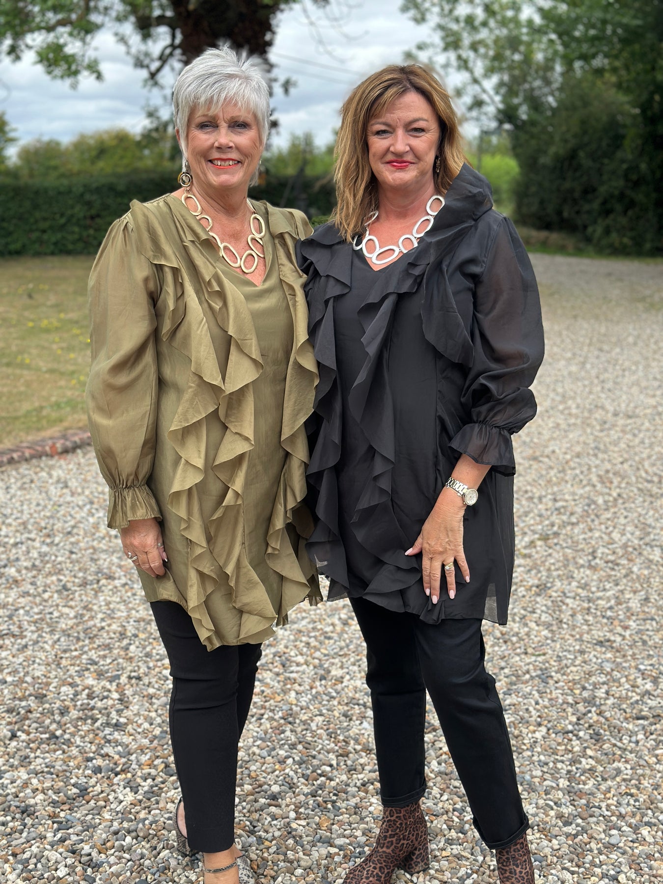 Make a statement with the Ruffle Detail Sheer Tunic Blouse. Featuring cascading ruffle layers, a deep V-neckline, and sheer long sleeves with gathered cuffs, this blouse is the perfect blend of elegance and femininity. With a lightweight, fluid drape and a lined body for comfortable coverage, it’s an effortless piece that elevates any wardrobe.