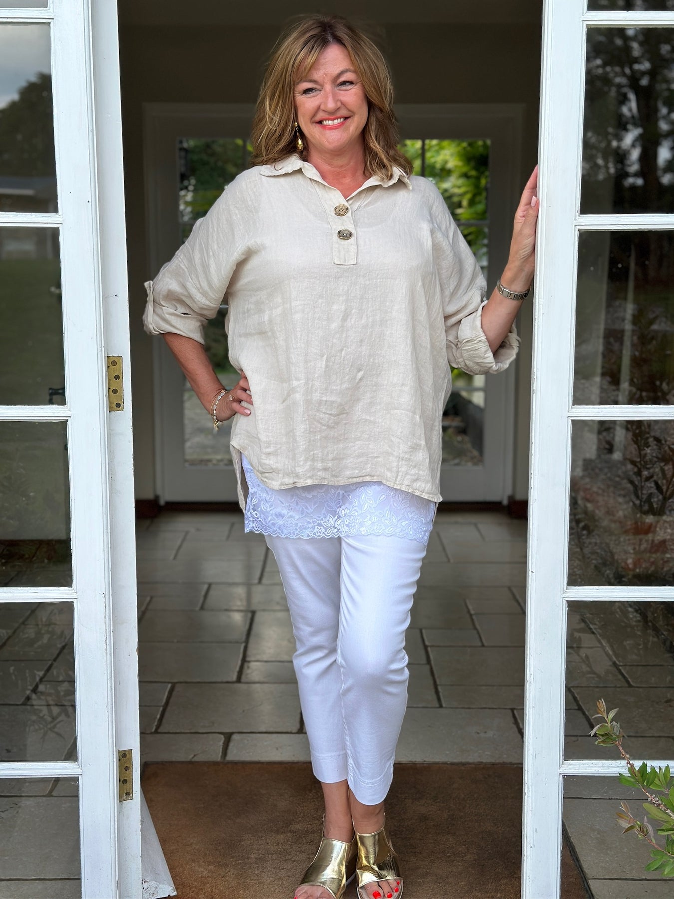 This linen top features a double gold button detail that adds a refined touch to its design. It is crafted with rolled tab sleeves and a flat large collar, combining comfort with a sophisticated silhouette. Ideal for layering or wearing on its own, this piece offers breathable fabric and elegant accents for a polished, expert look.