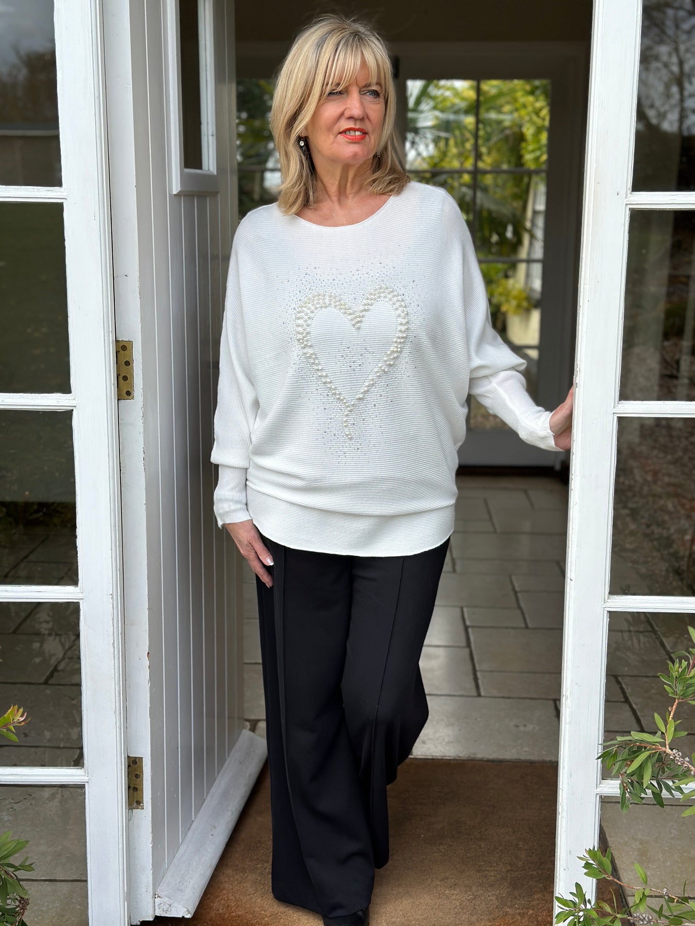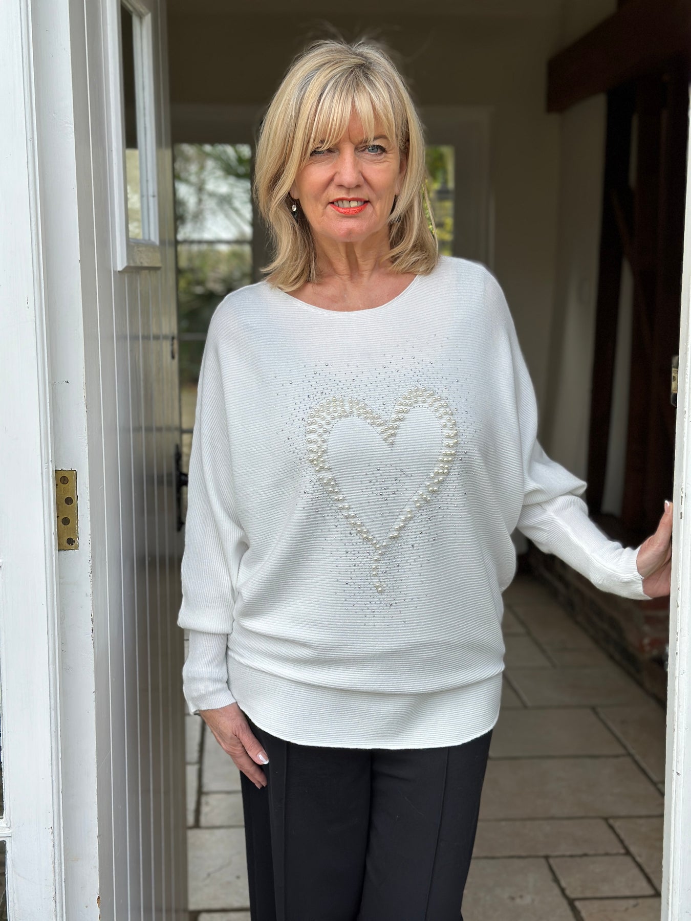 Add a touch of sparkle to your everyday look with this beautifully detailed Pearl Heart Batwing Jumper. Crafted in a soft ribbed knit, this elegant jumper features a relaxed batwing shape for a flattering drape and all-day comfort.
