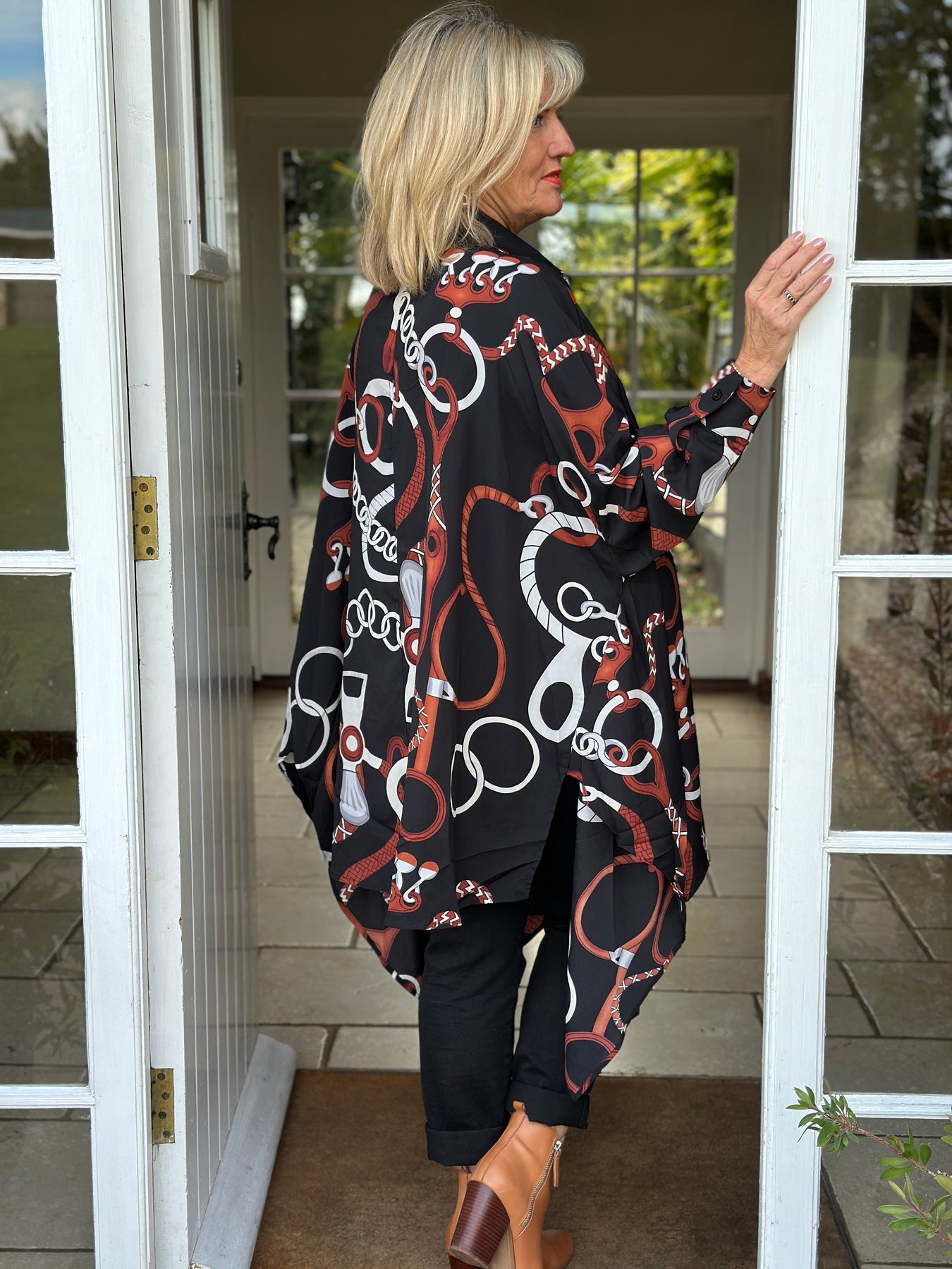 The overall vibe is a mix of retro 70s graphic prints and equestrian-inspired motifs-the ropes/laces suggest harnesses or reins