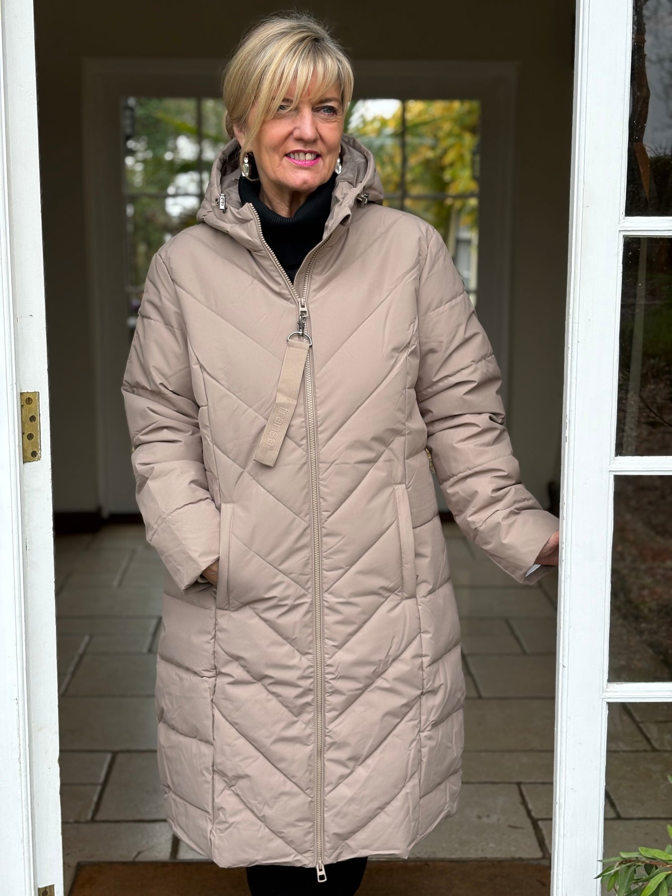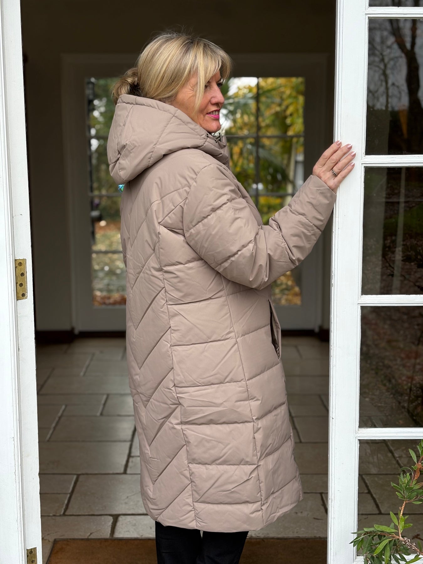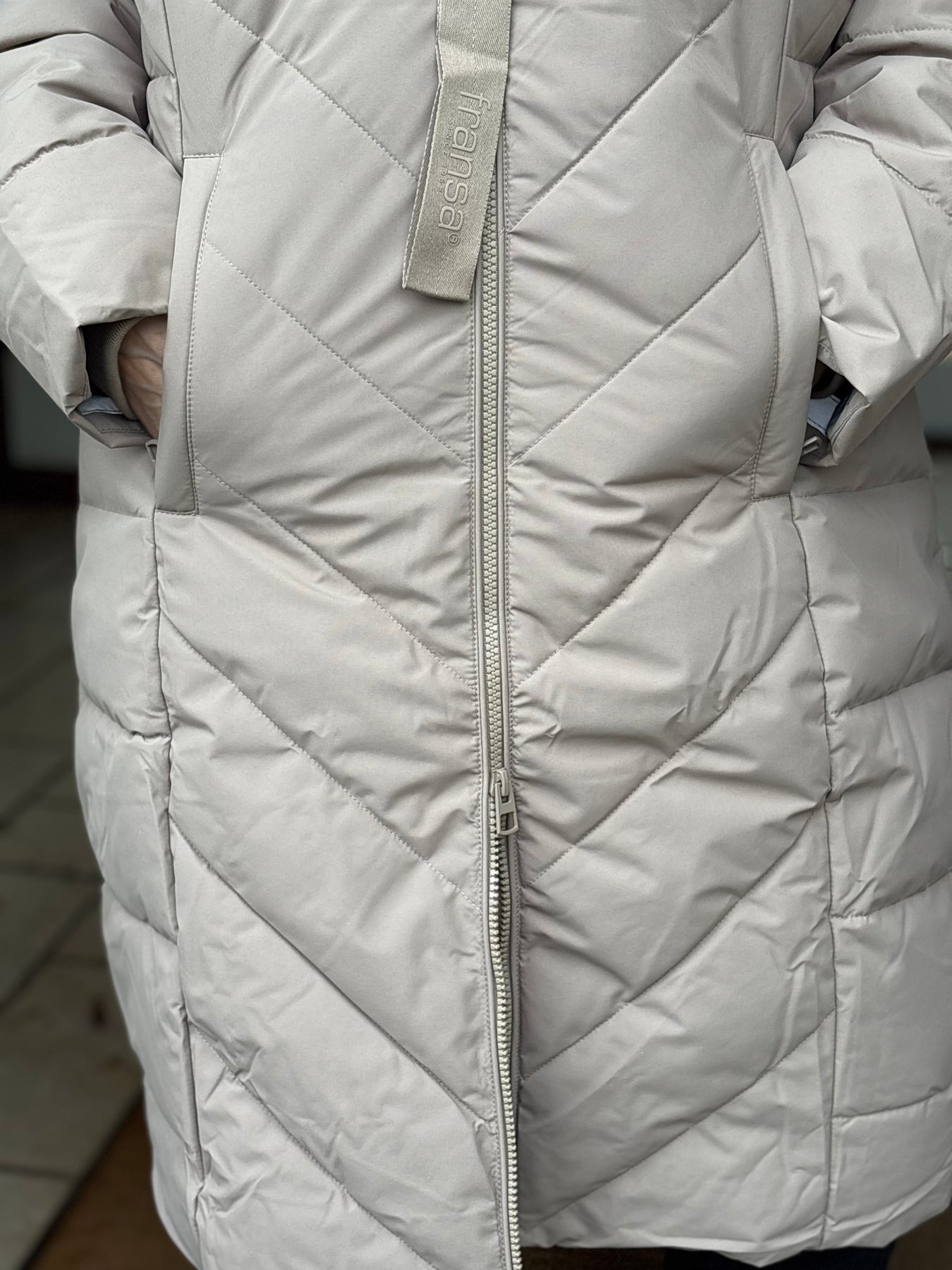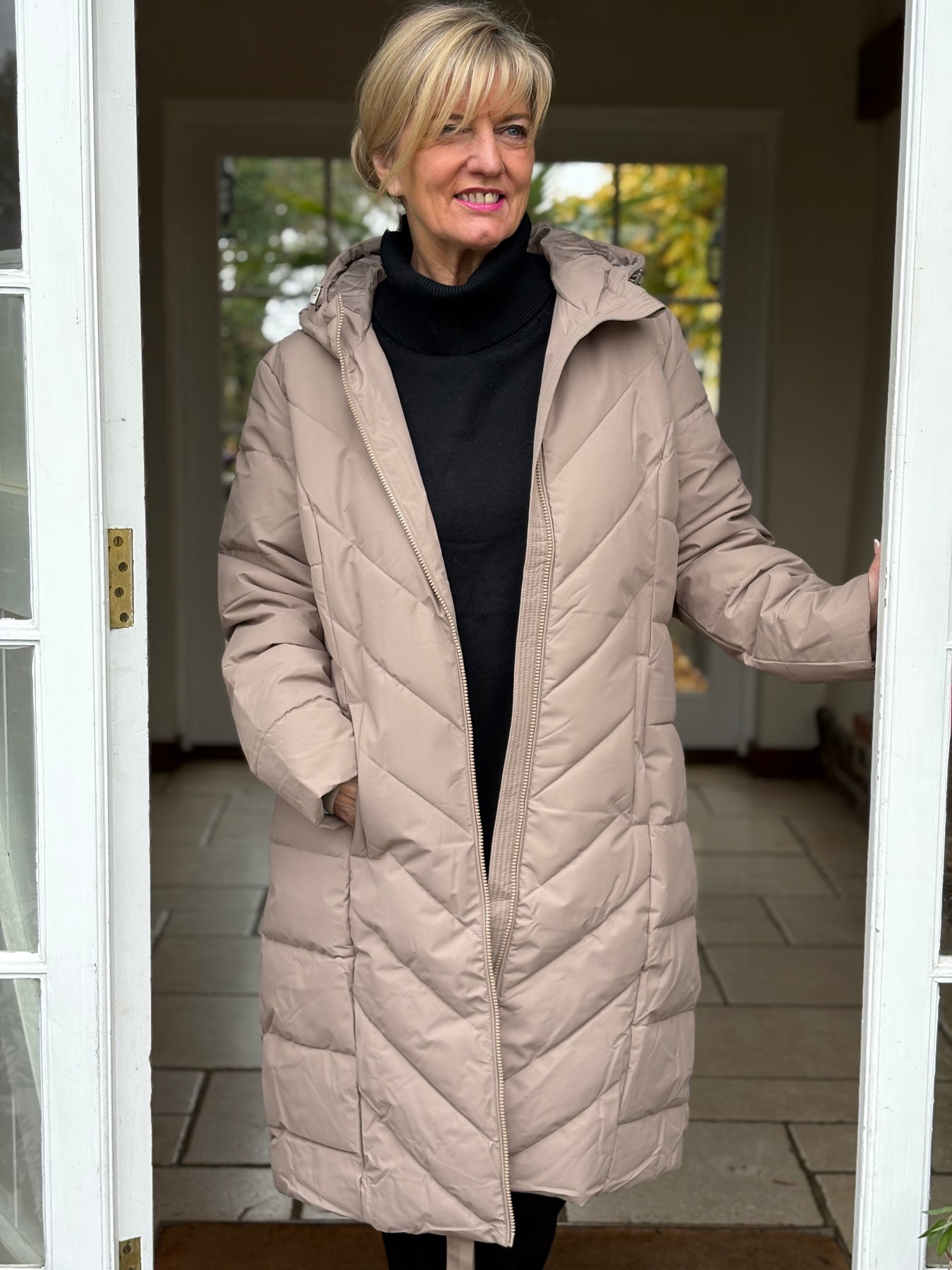 Stay warm and stylish with this gorgeous padded coat from Fransa. It features cosy horizontal quilting for a modern, feminine look. The coat includes a soft drawstring hood, practical zip fastening, and side pockets for everyday ease. Finished with fitted cuffs and long sleeves to keep out the chill, it’s the perfect outerwear choice for cold-weather days.