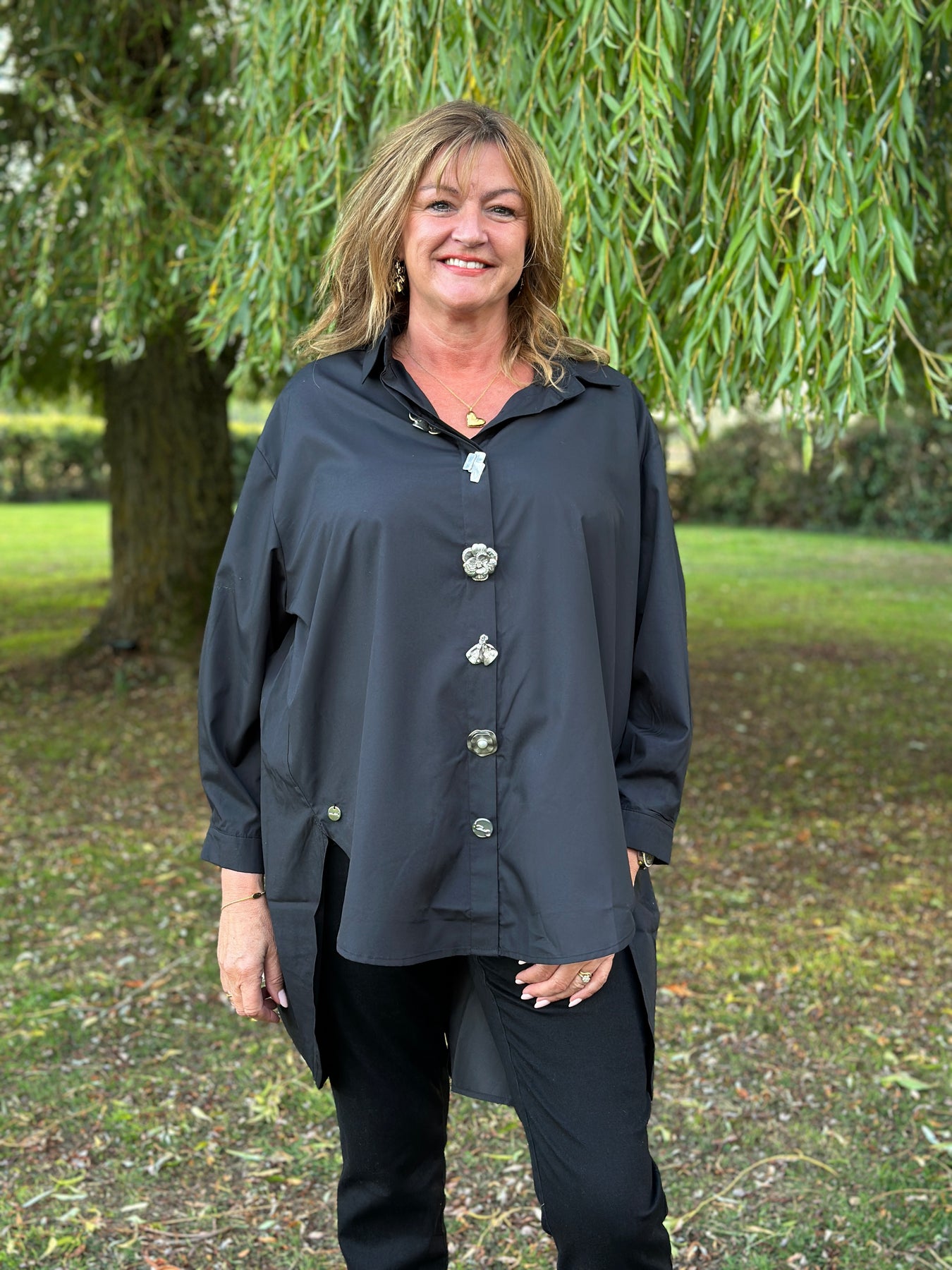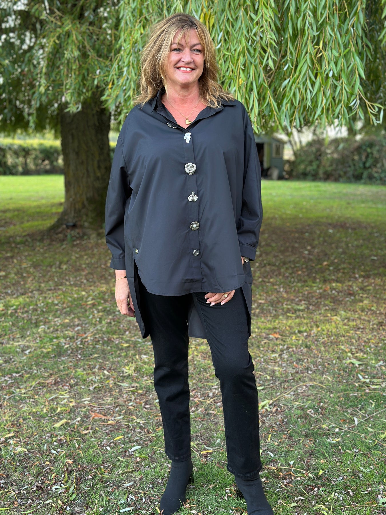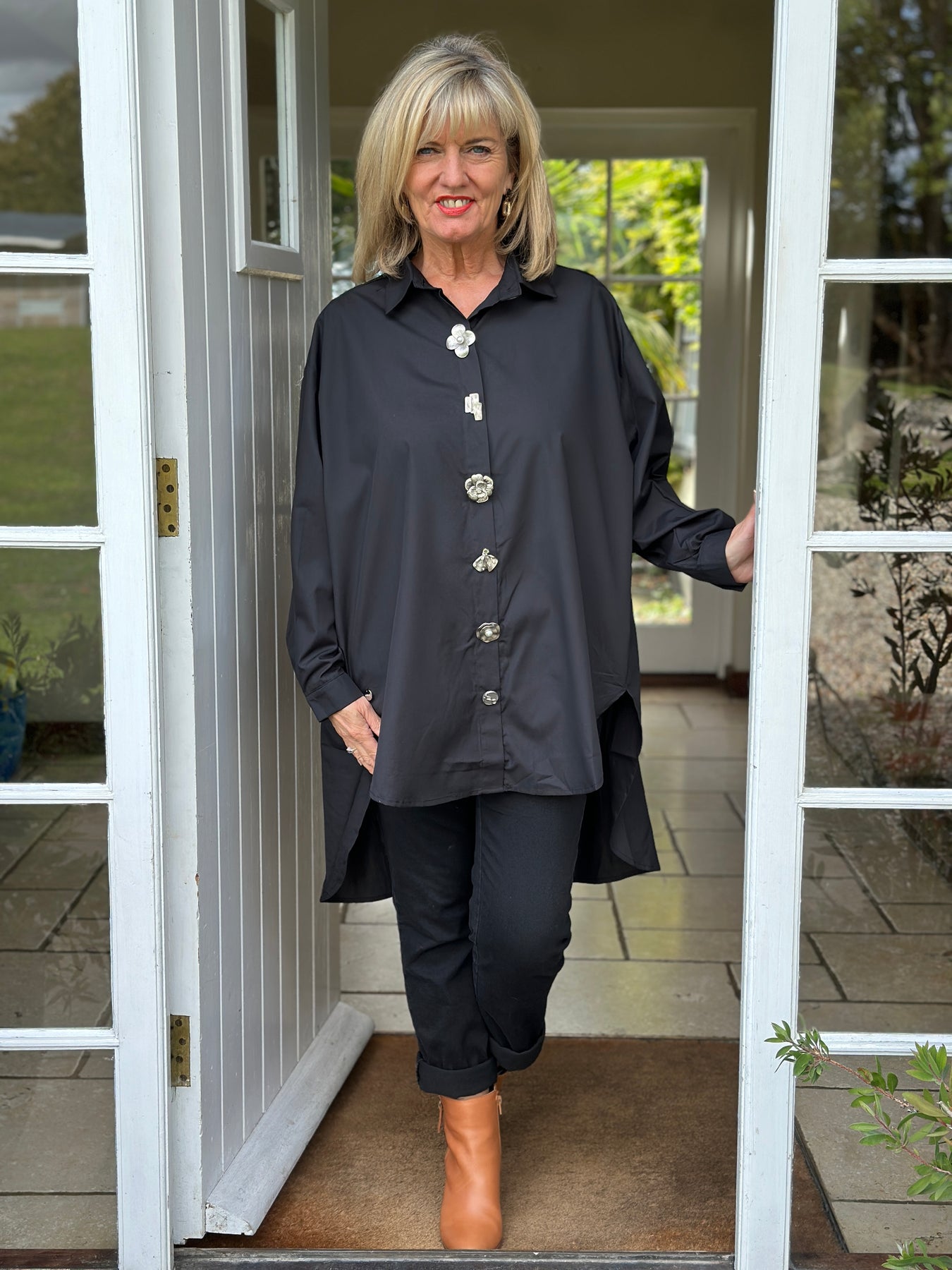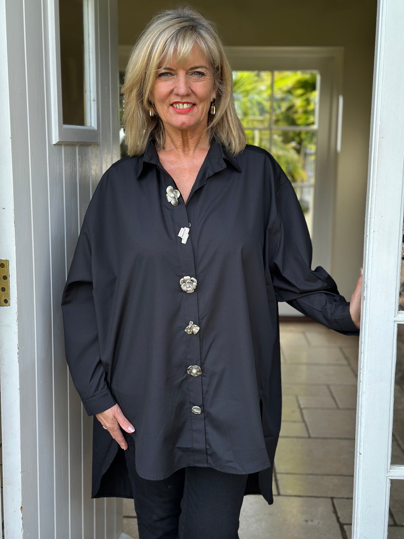Elevate your everyday style with the Malissa J Oversized Button Shirt. Cut in an oversized fit for effortless comfort, this versatile shirt is brought to life with striking gold button fastenings that add a touch of luxury. Featuring a classic collar, button cuffs, and a dipped hem front and back, it’s perfect for wearing loose over jeans or leggings, or styled tucked in for a more polished look.